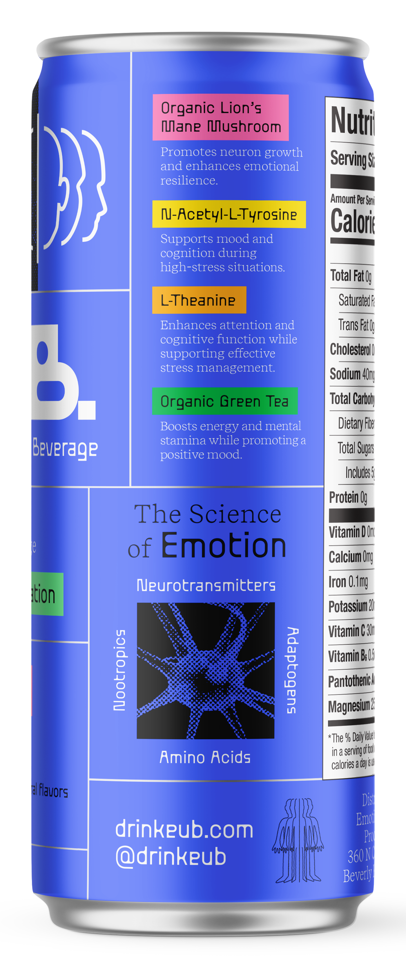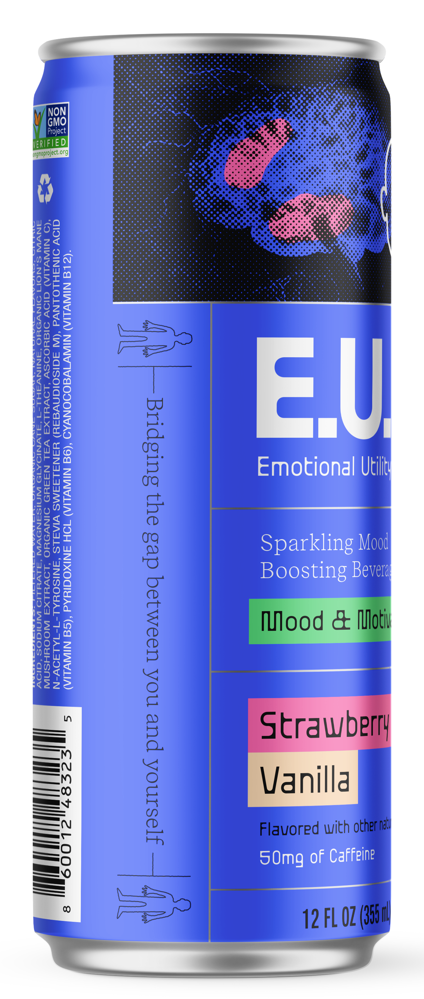 A luscious dessert, now in a healthy, sparkling form. All natural vanilla aromas shines through as soon as the can pops. The taste of sweet strawberries and creamy vanilla makes you think you’re having a delightful treat but with only 25 calories and 5g of sugar, E.U.B. Strawberry Vanilla is a functional sparkling beverage that supports the body's chemical messengers ("neurotransmitters") to boost mood and motivation. Featuring Organic Lion's Mane Mushroom, L-Tyrosine, L-Theanine, 50mg Organic Green Tea Caffeine, Vitamin B5 & B6, and Magnesium.