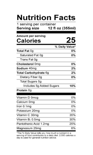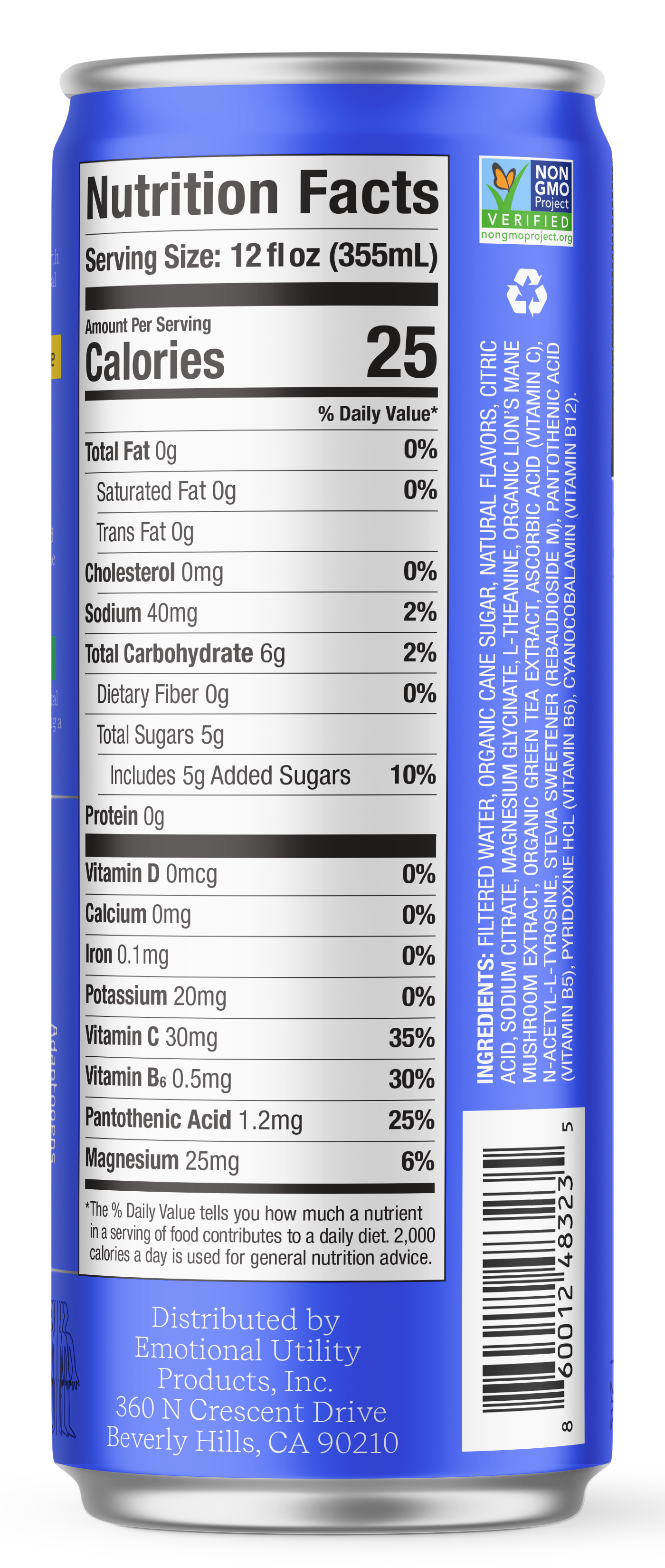 Filtered Water, Organic Cane Sugar, Natural Flavors, Citric Acid, Sodium Citrate, Magnesium Glycinate, L-Theanine, Organic Lion's Mane Mushroom Extract, Organic Green Tea Extract, Ascorbic Acid (Vitamin C), N-Acetyl-L-Tyrosine, Stevia Sweetener (Rebaudioside M), Pantothenic Acid (Vitamin B5), Pyridoxine HCL (Vitamin B6).